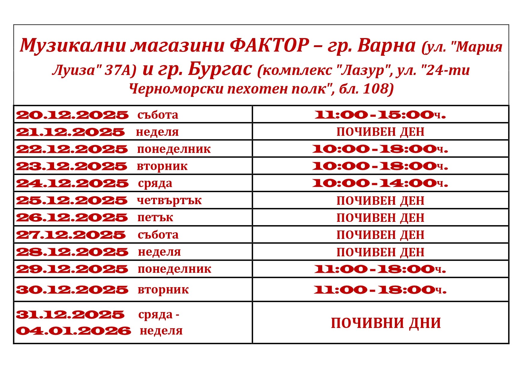 КОЛЕДНО РАБОТНО ВРЕМЕ