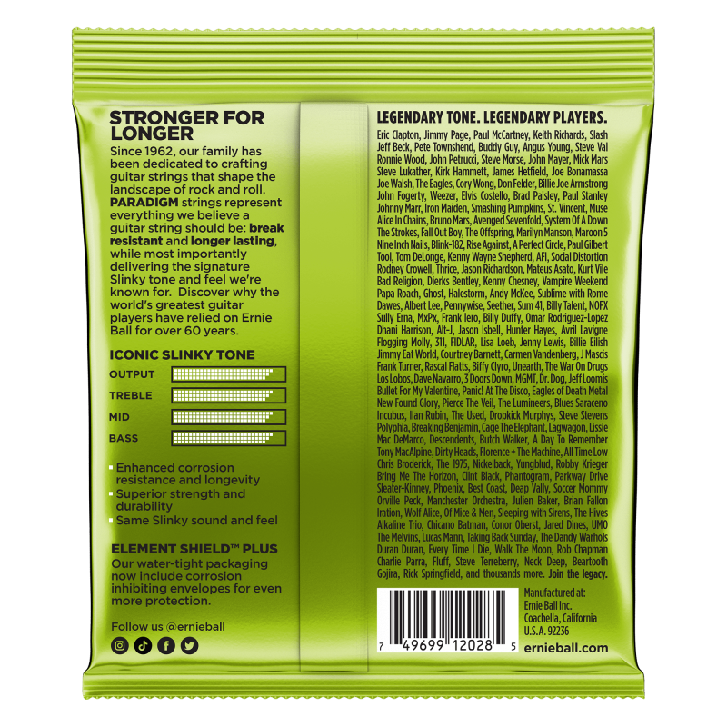 Струните за електрическа китара Ernie Ball Slinky Paradigm осигуряват безпрецедентна здравина и по‑дълъг живот, като същевременно запазват 100% характерния Slinky тон и усещане. Ултра‑здравата стомана на Ernie Ball, лидер в индустрията, се използва както при навитите, така и при гладките (plain) струни, а патентованото подсилване при усукването до топчето на всяка гладка струна осигурява изключителна якост на опън и устойчивост на умора. Това позволява струните да се настройват бързо и да издържат дори на най‑агресивните стилове на свирене и най‑тежките условия. Комбинацията от Everlast нанопокритие и иновативната плазмено обогатена намотка осигурява допълнителна защита от корозия и значително намалява натрупването на замърсявания, които "убиват" тона. Това е първият комплект дълготрайни струни, които наистина си заслужават — всички предимства, без никакви компромиси.