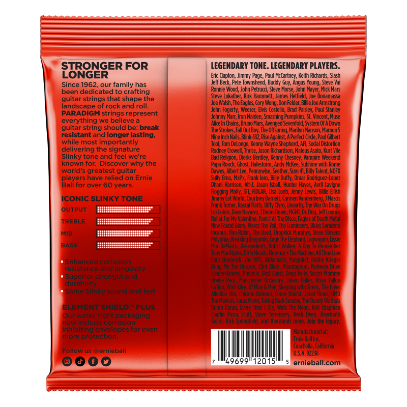 Струните за електрическа китара Ernie Ball Slinky Paradigm осигуряват безпрецедентна здравина и по‑дълъг живот, като същевременно запазват 100% характерния Slinky тон и усещане. Ултра‑здравата стомана на Ernie Ball, лидер в индустрията, се използва както при навитите, така и при гладките (plain) струни, а патентованото подсилване при усукването до топчето на всяка гладка струна осигурява изключителна якост на опън и устойчивост на умора. Това позволява струните да се настройват бързо и да издържат дори на най‑агресивните стилове на свирене и най‑тежките условия. Комбинацията от Everlast нанопокритие и иновативната плазмено обогатена намотка осигурява допълнителна защита от корозия и значително намалява натрупването на замърсявания, които "убиват" тона. Това е първият комплект дълготрайни струни, които наистина си заслужават — всички предимства, без никакви компромиси.