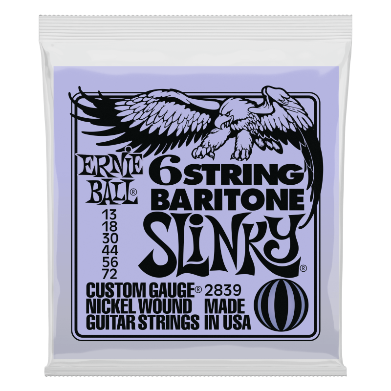 Ernie Ball Nickel Wound 6-string Baritone Electric Guitar Strings are made from nickel plated steel wrapped around a hex shaped steel core wire. The plain strings are made of specially tempered tin plated high carbon steel. Each bass guitar string produces a bright, balanced tone and manufactured with small ball ends like guitar strings, not large ball ends used on traditional electric guitar strings. These sets are optimal for A-A or B-B tuning combinations and are a perfect match for baritone instruments. Gauges .013, .018p, .030, .044, .056, .072