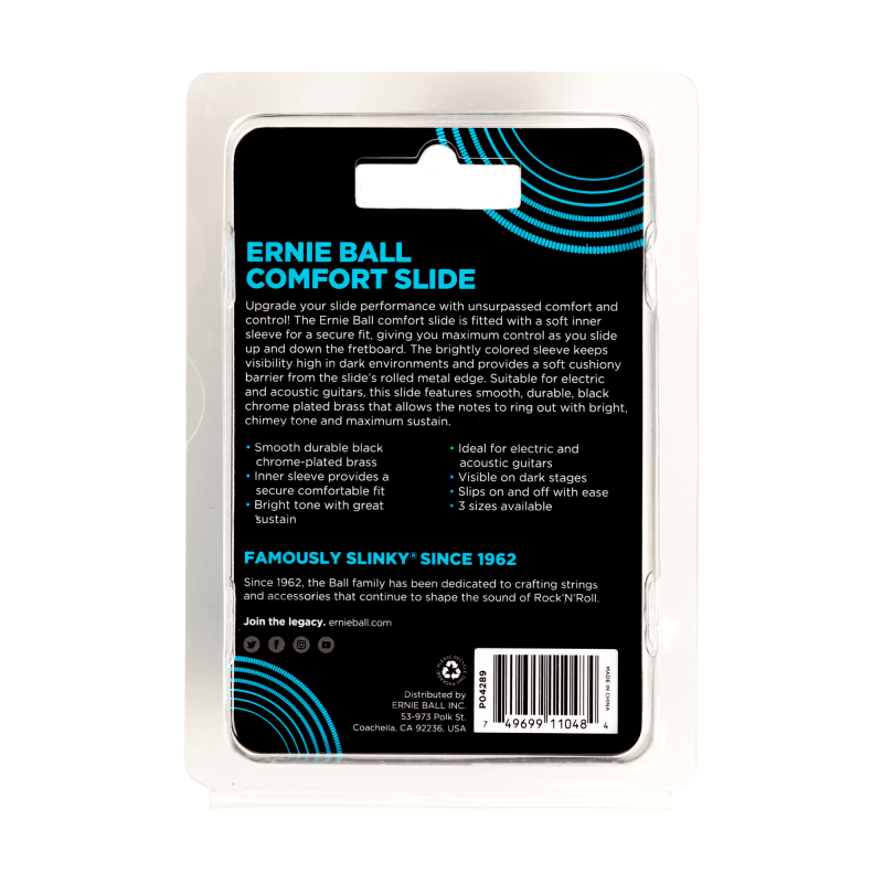 Upgrade your slide performance with unsurpassed comfort and control. The Ernie Ball comfort slide is fitted with a soft inner sleeve for a secure fit, giving you maximum control as you slide up and down the fretboard. The brightly colored sleeve keeps visibility high in dark environments and provides a soft cushiony barrier from the slides’ rolled metal edge. Suitable for electric and acoustic guitars, this slide features smooth, durable, black chrome plated brass that allows the notes to ring out with a bright, chimey tone and maximum sustain.