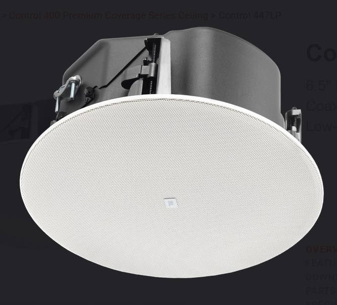 The JBL Control 447LP, part of the flagship Control 400 Premium Coverage Series, is a two-way coaxial ceiling loudspeaker featuring a 6.5” woofer, conical RBI™, and a low-profile enclosure that is ideal for applications where ceiling plenum space is restricted.